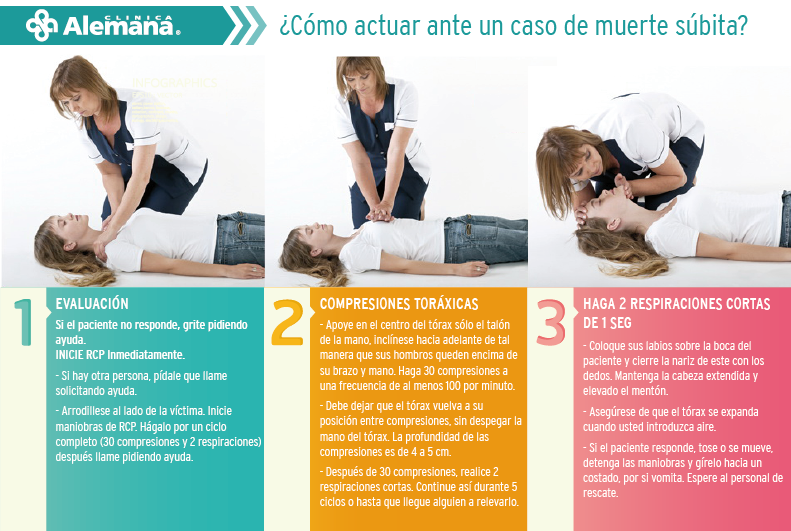 Se trata de una emergencia de vida o muerte, cuyo objetivo es que el paciente salga del paro sin secuelas y que el ritmo cardiaco vuelva a su normalidad. Las primeras medidas son pedir ayuda a otras personas que estén en el lugar, ver si el paciente reacciona a estímulos (tocar la cara, levantar los hombros) y comprobar si hay respiración. Si nada de esto ocurre, debe considerarse que la víctima está en paro cardiaco. Es importante asegurarse de que en la boca no haya elementos con los cuales se pueda asfixiar. Rápidamente se deben iniciar maniobras de reanimación cardiopulmonar (RCP) (ver infografía), mientras otra persona llama al centro asistencial más cercano, con la indicación muy precisa de que hay un paciente en paro cardiaco para que el equipo de rescate llegue preparado.