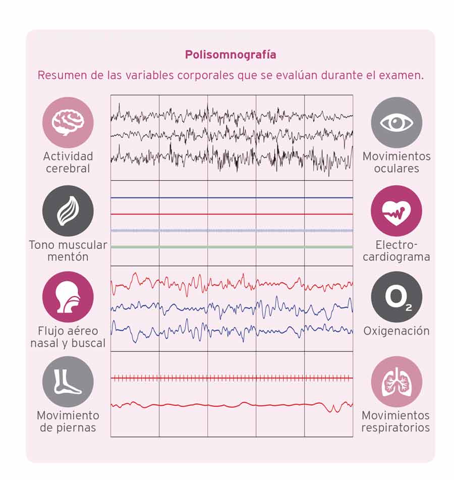 Para poder objetivar, cuantificar y caracterizar las apneas, se realiza un examen llamado polisomnografía, que registra simultáneamente múltiples variables corporales durante el sueño y da la información final sobre si se trata de un simple ronquido, Resistencia Aumentada en la Vía Aérea o apneas. En este caso, además, indica con qué frecuencia se producen, si hay desaturación de oxígeno (baja de la oxigenación sanguínea) y qué tan profunda es.