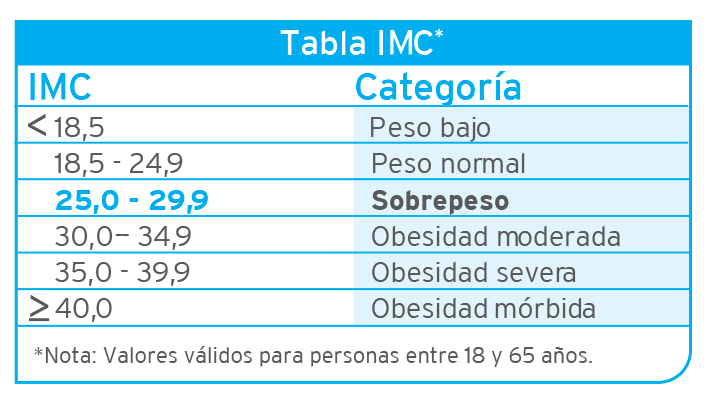 Actualmente se calcula el Índice de Masa Corporal (IMC) y según el valor obtenido se clasifica el nivel de sobrepeso.