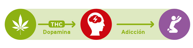 Al igual que otras drogas de abuso, el THC estimula el circuito del placer, produciendo liberación de una sustancia química llamada dopamina. Esto tiene que ver con su potencial de producir adicción.